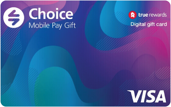 The Choice Visa Digital Gift Card lives in your phone's digital wallet and can be spent anywhere Apple Pay or Google Pay is accepted. The Choice Visa Digital Gift Card is sent via email and stored in the recipient's digital wallet.